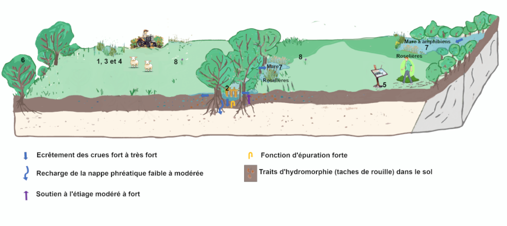 7 : L’adoucissement de la pente autour du cours d’eau permettra la création de roselières[2] et de mares temporaires. Cela augmentera la capacité de stockage de l’eau et la diversification des habitats pour l’accueil des amphibiens et des odonates[3].