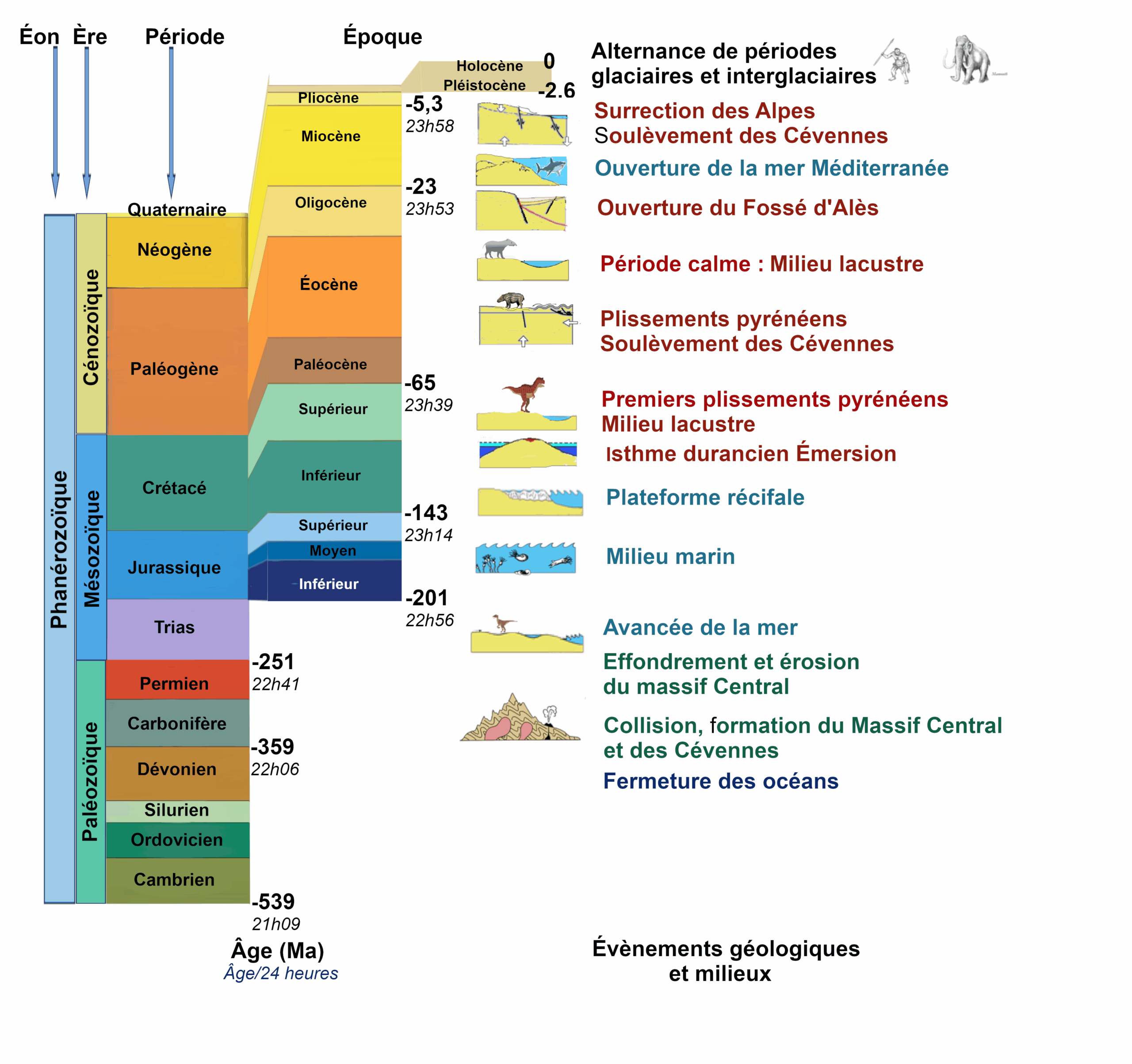 Fig.5 Échelle des temps géologiques avec localisation de la formation du fossé d’Alès et des olistolithes.