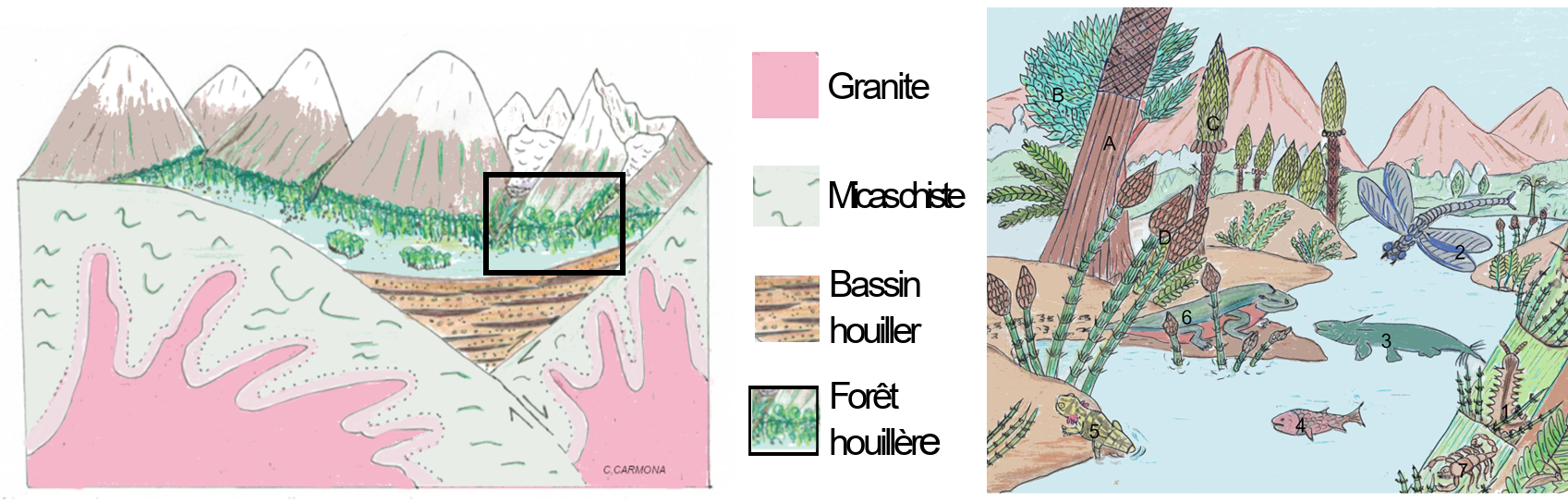 La flore : A : Lépidodendron[1], B : Cordaïtale[2], C : Sigillaire[3], D : Calamite[4] = prêle géante.